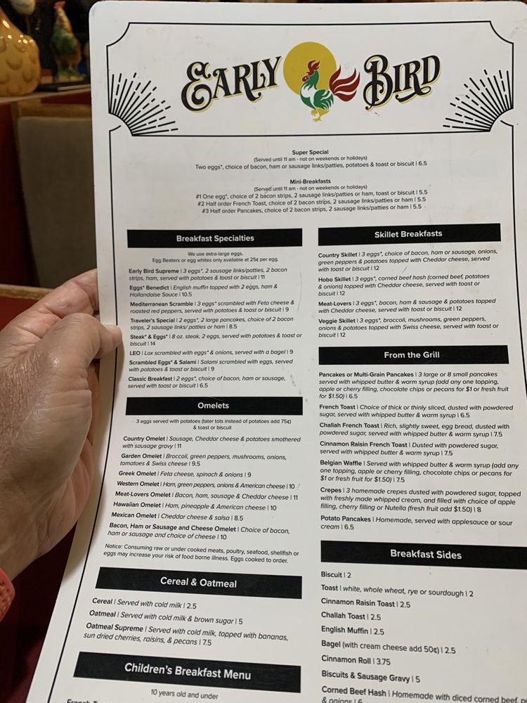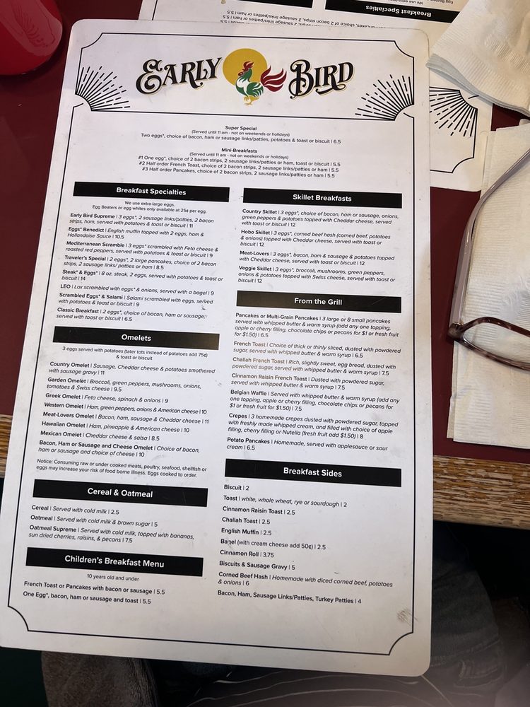 Early Bird Cafe offers amenities such as Takeout, Good for Kids, Outdoor Dining, Outdoor Parking, Parking Lot, Brunch, Accepts Contactless Payments, Takeout, Good for Kids, Outdoor Dining, ensuring a comfortable and convenient experience for clients.